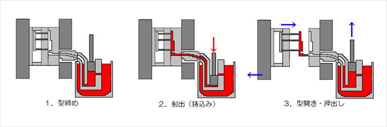 1. 주로 Zn, Sn, Pb, Mg합금 등의 주조에 사용된다. 2. 얇고 복잡한 모양의 주물을 만들 수 있다. 3. 사출부가 용탕 안에 있기 때문에 주탕 할 필요가 없고, 주조 cycle이 빠르다. 750회/h 4. 가압실이 용해로 안에 담겨져 있어 plunger로 용탕을 사출한다. 5. 가압실의 구조상 주조압력이 낮다. (7MPa ~ 25MPa) 6. 산화물, 공기혼입이 적다.